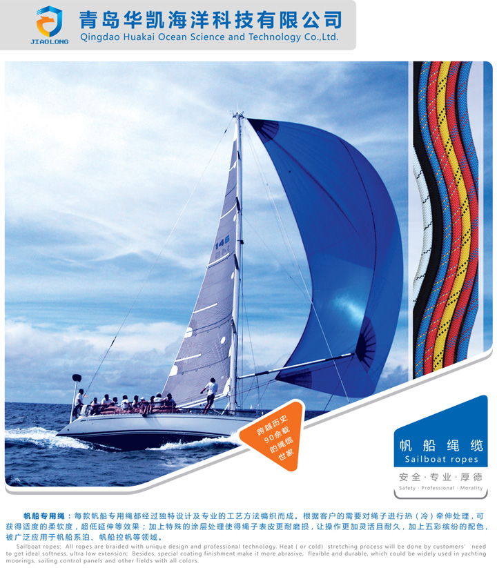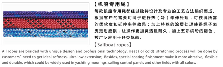 帆船專用繩:每款帆船用繩都經(jīng)過獨特設(shè)計及專業(yè)的工藝方法編織而成,根據(jù)客戶的需要對繩子進行冷(熱)牽伸處理,可獲得所需的柔軟度和延伸率的效果;加上特殊的涂層處理使得繩子表面更耐磨損,讓操作更加靈活且耐久,加上五彩繽紛的配色,被廣泛應(yīng)用于各類帆船。