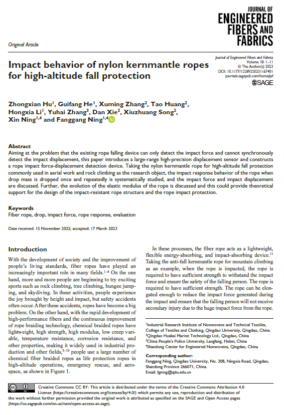 2023年3月17日青島海麗雅集團(tuán)科研方面再創(chuàng)佳績(jī)。海麗雅集團(tuán)與青島大學(xué)、中國(guó)人民警察大學(xué)共同合作的《Impact behavior of nylon kernmantle ropes for high-altitude fall protection》(高空墜落防護(hù)用尼龍夾心繩索沖擊行為)學(xué)術(shù)論文,在權(quán)威期刊《Journal of Engineered Fibers and Fabrics》發(fā)表。
